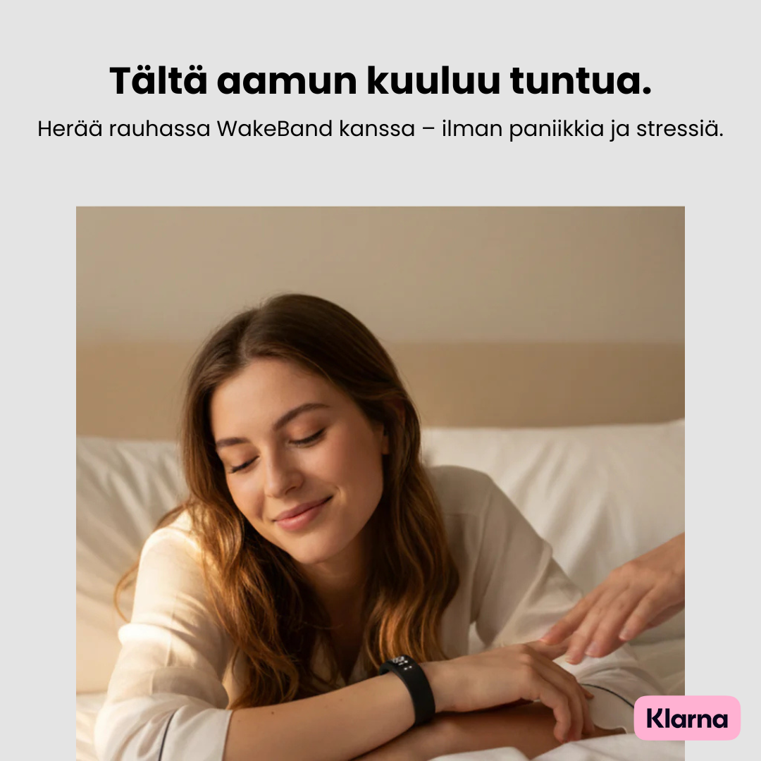 WakeBand herättää sinut voimakkaalla värinällä suoraan kehon kautta, ei äänen avulla. Heräät ajoissa ilman stressiä, ilman kovia hälytyksiä – ja ilman että kumppanisi herää.