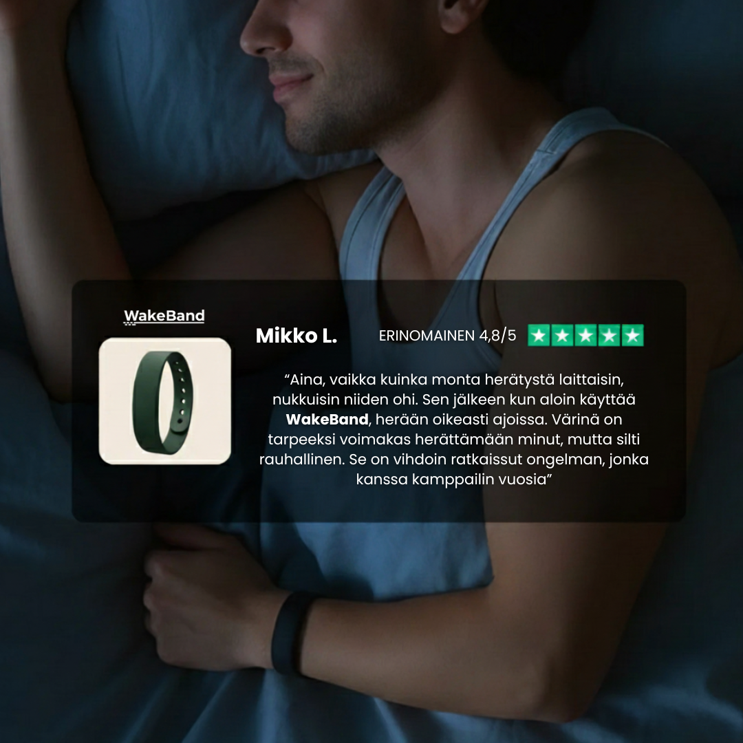 WakeBand herättää lähettämällä värinäsignaaleja suoraan ranteeseesi asetettuna herätysaikana. Toisin kuin ääni, jonka aivot voivat oppia sivuuttamaan, nämä fyysiset impulssit kulkevat hermoston kautta ja saavat kehon heräämään automaattisesti. Siksi värinä on paljon luotettavampi kuin äänihälytykset, erityisesti raskaille nukkujille.